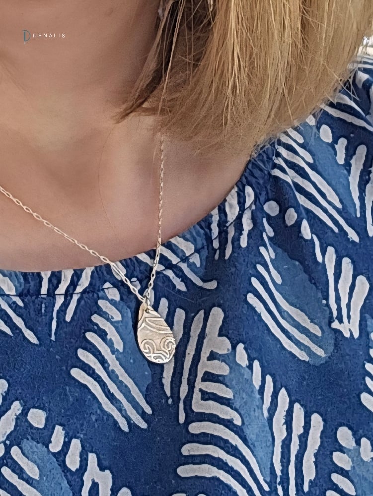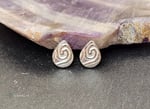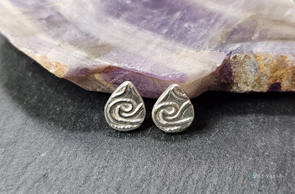 A pair of handcrafted fine silver stud earrings, shaped like soft teardrops and detailed with a raised swirling pattern on one side, echoing the graceful movement of ocean waves.