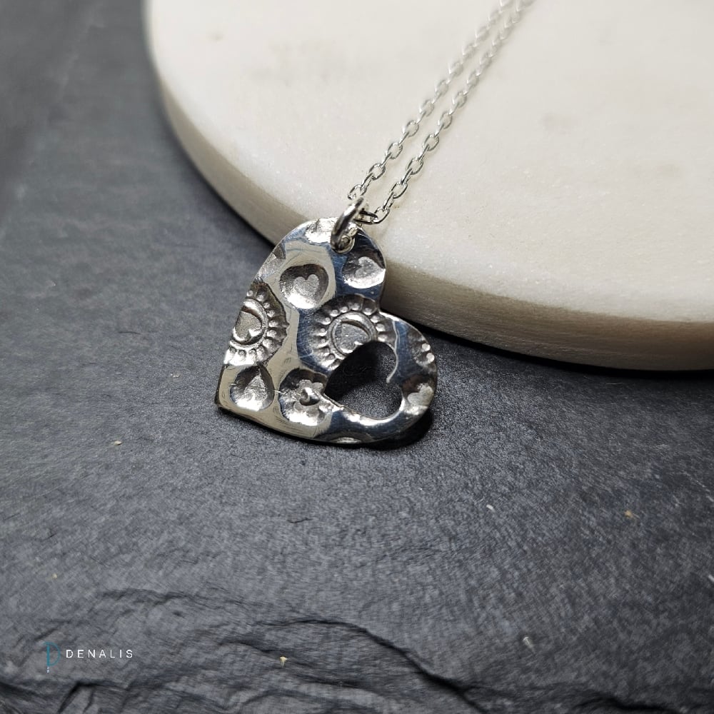 This handcrafted fine silver pendant features a playful and textured heart design, brought to life with an array of tiny embossed hearts and floral-like circular motifs.