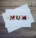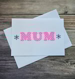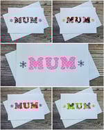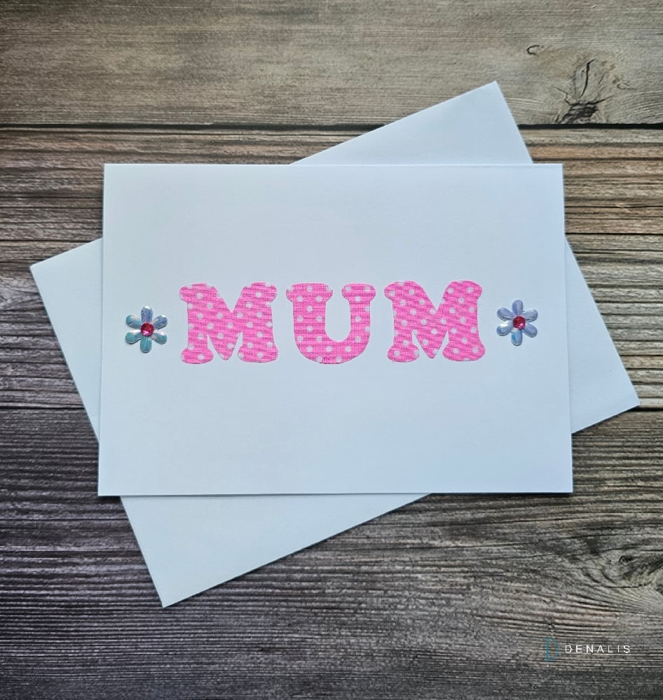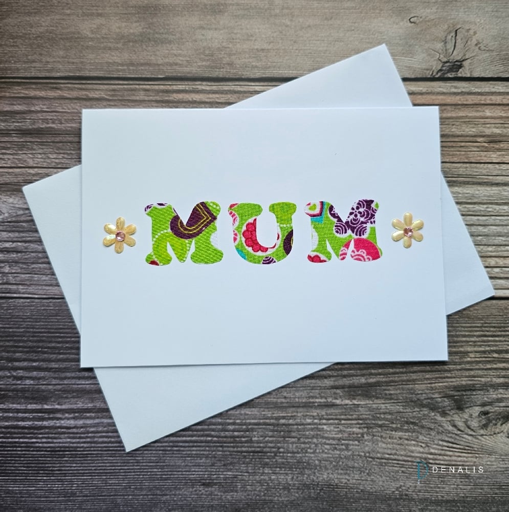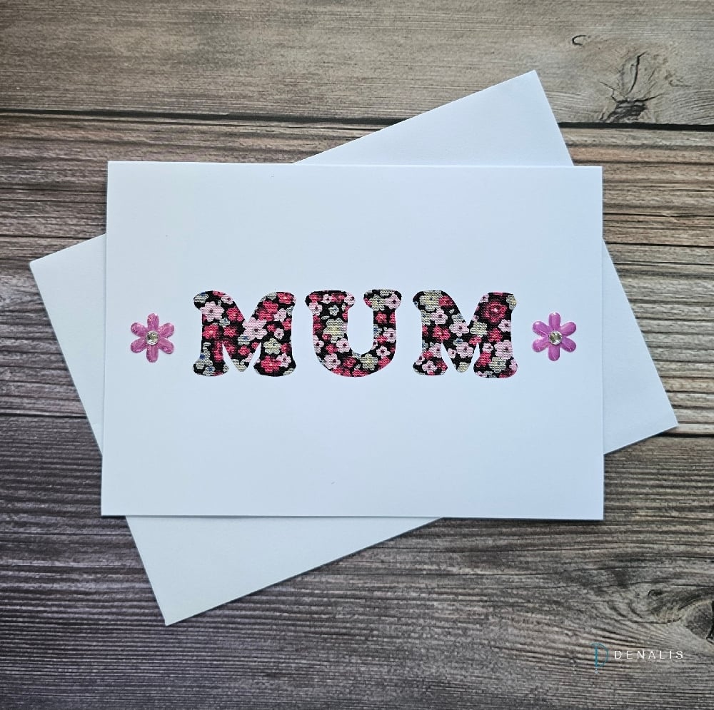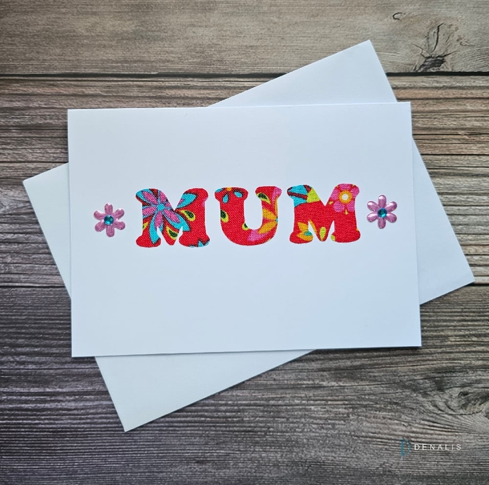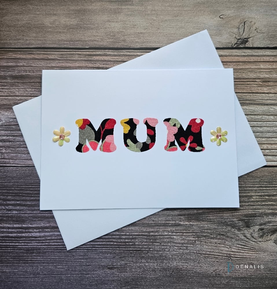 A beautifully crafted "MUM" card, hand-lettered in bold fabric letters with sequin daisies, with a glitter gem centre, to either side. Each letter is individually hand cut from patterned fabric, making every card completely unique.