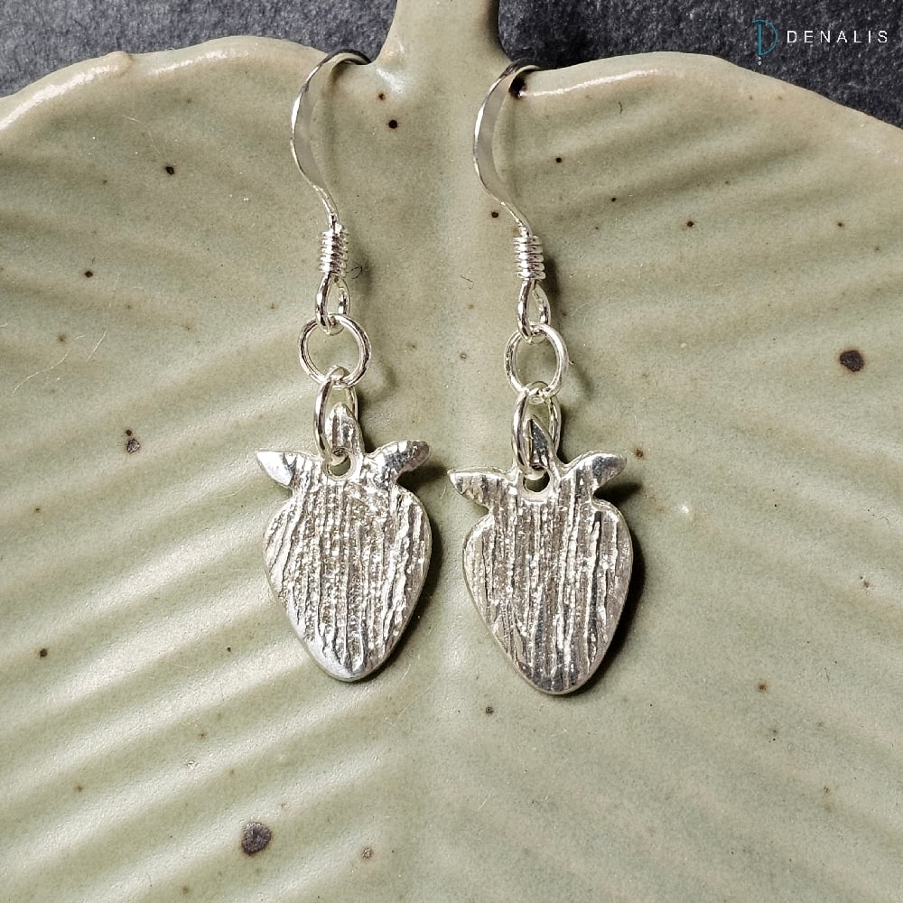 A pair of subtly textured fine silver strawberry-shaped drop earrings, handcrafted using silver precious metal clay. Suspended from sterling silver hooks, they catch the light beautifully.